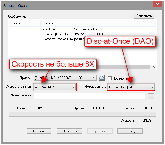 4. В открывшемся окне выбираем Скорость записи, не больше 8Х. Метод записи - Disc-at-Once. Если хотите провести проверку диска после записи, ставьте флажок на пункте Проверка.